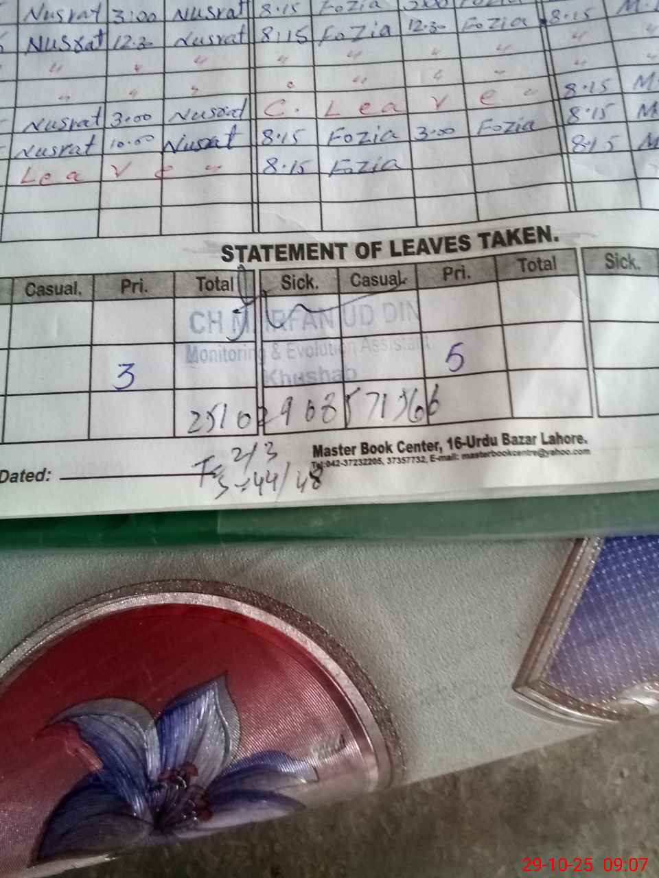 | CNIC | Full Name | Designation | R/C | Absence During Last Calender Month |