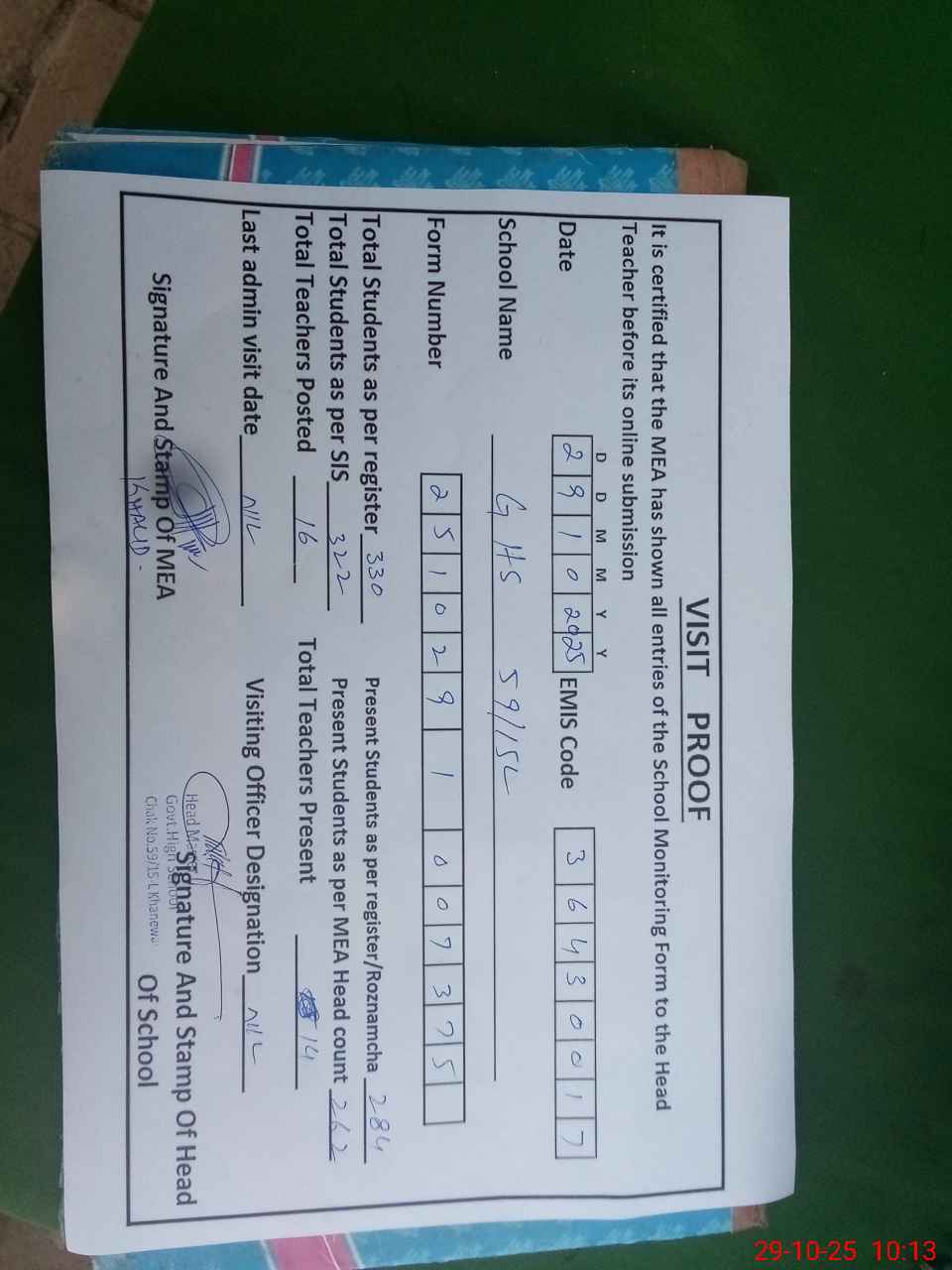 | Certified that this School was Inspected by the Undersigned MEA/DMO Today and the Information Stated Above is as Per Record. | |||||