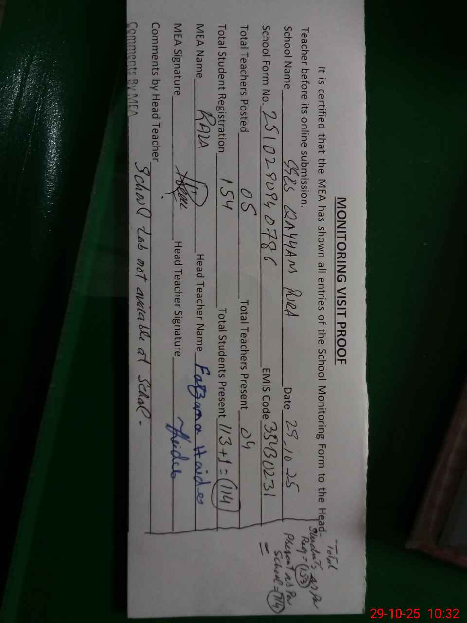 | Attendance Register | Head Teacher | MEA with School | Visit Proof |