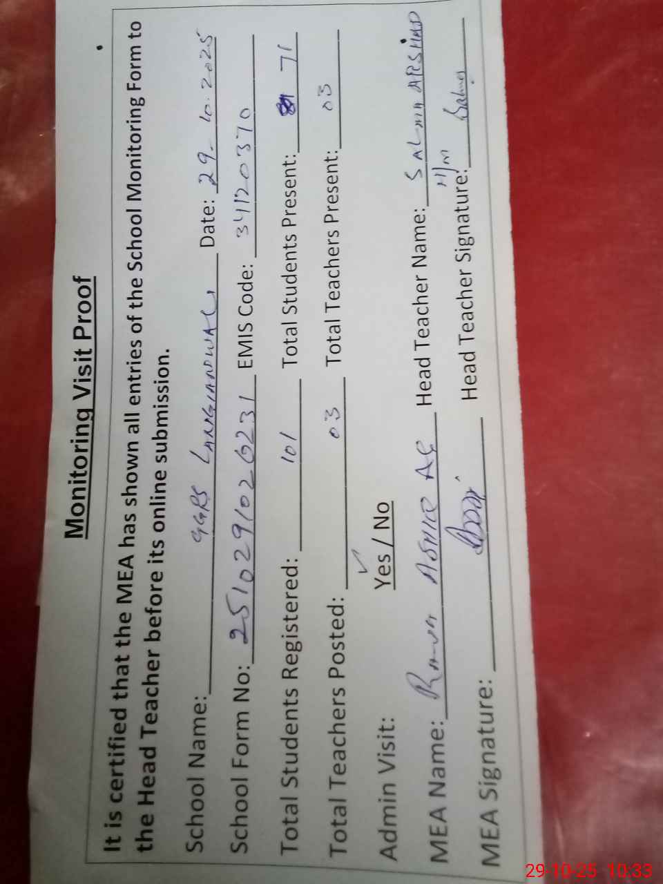 | Attendance Register | Head Teacher | MEA with School | Visit Proof |