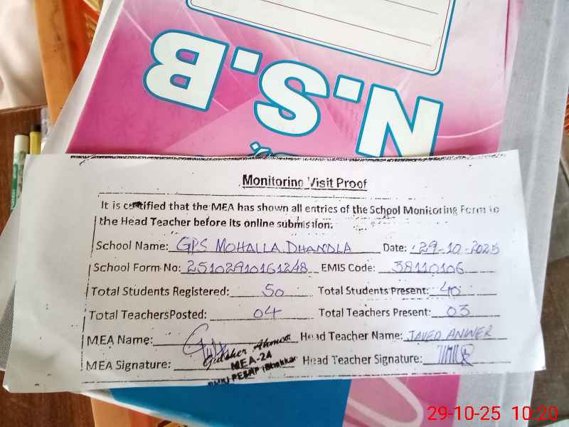 | EMIS Code: 38110106 | Name of School: GPS MOHALLA DHANDLA | |||
