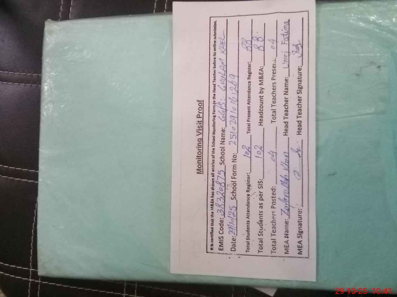 | Attendance Register | Head Teacher | MEA with School | Visit Proof |