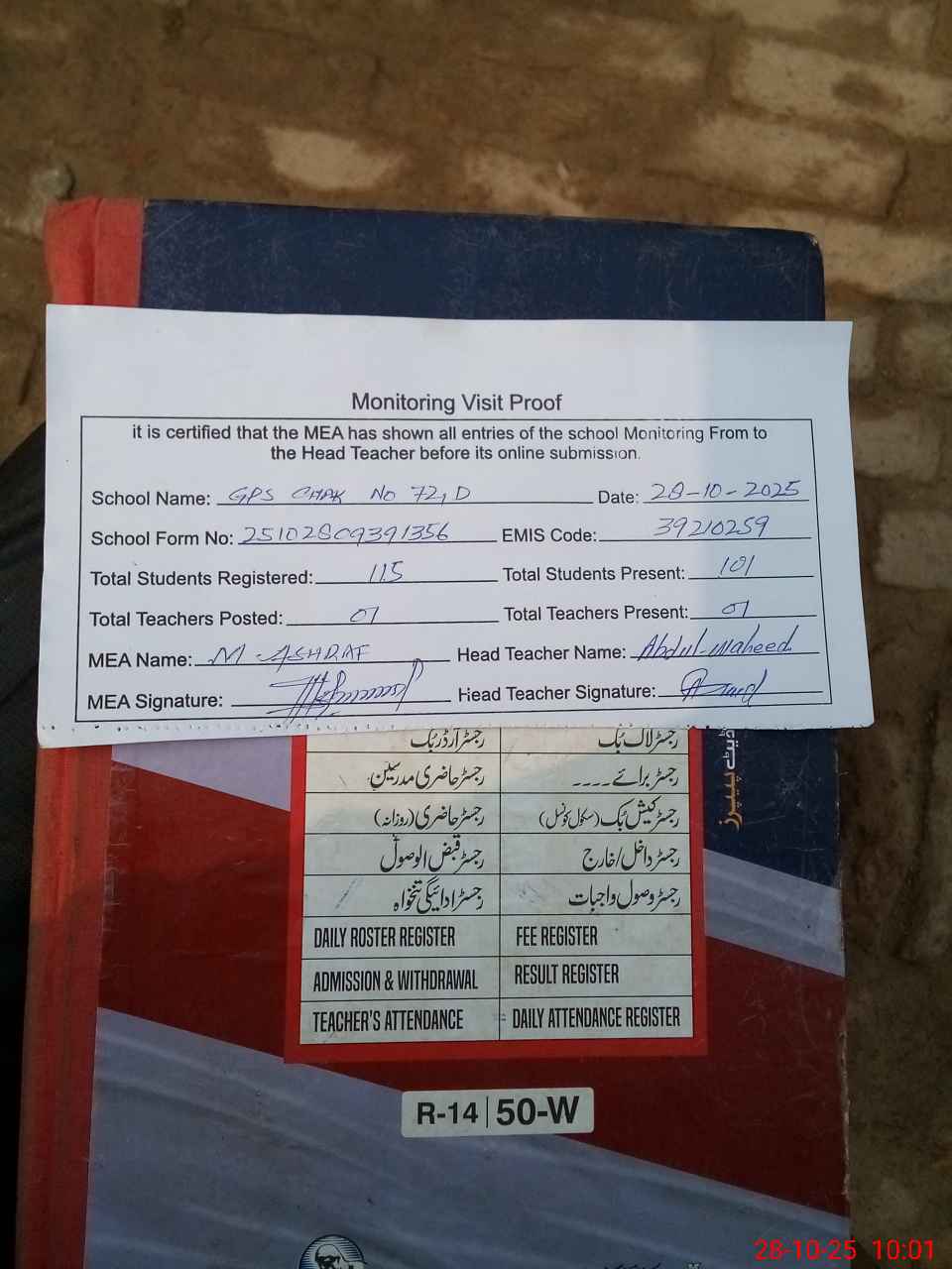 | Attendance Register | Head Teacher | MEA with School | Visit Proof |
