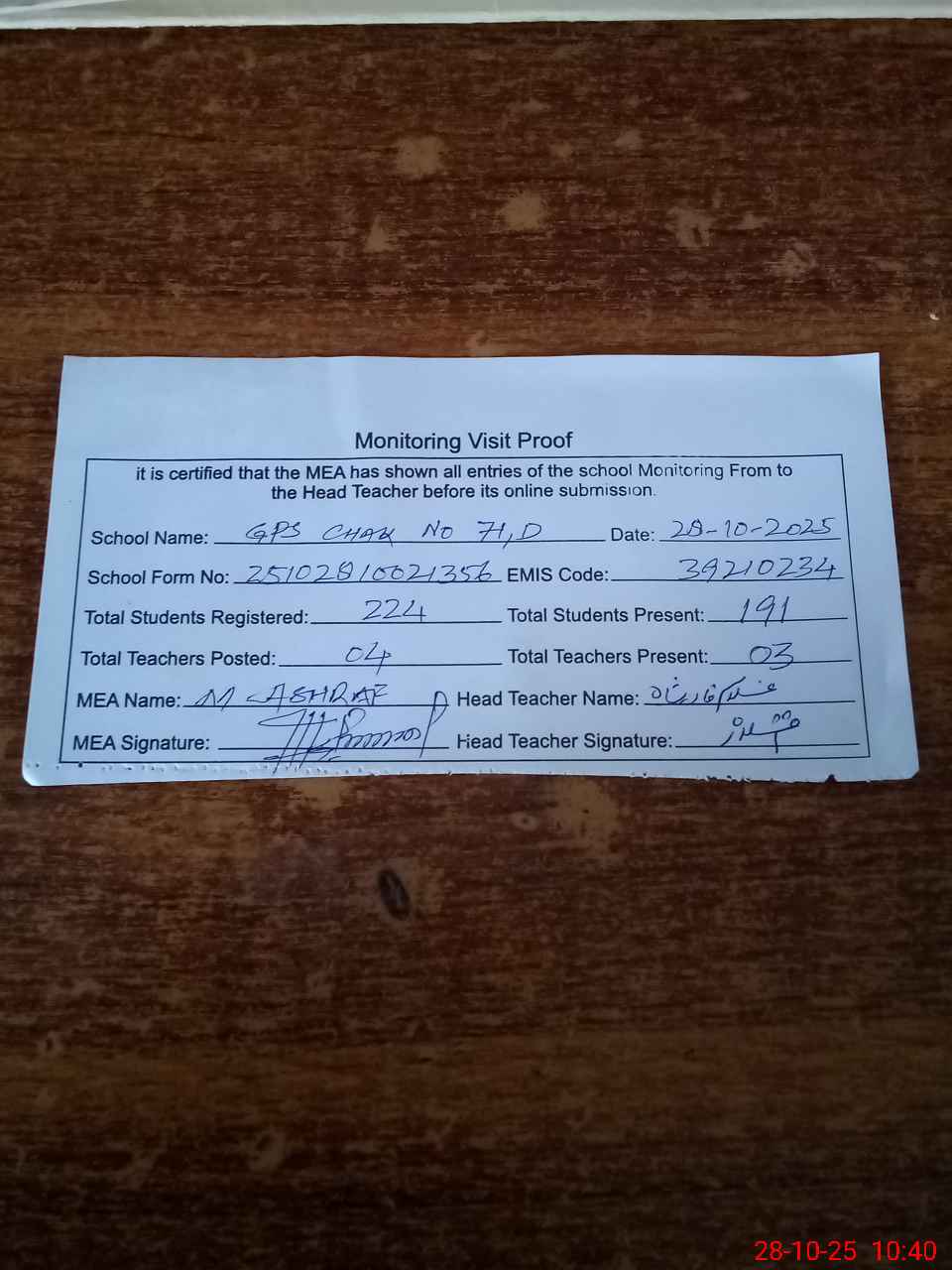 | EMIS Code: 39210234 | Name of School: GPS CHAK NO. 71 D | |||