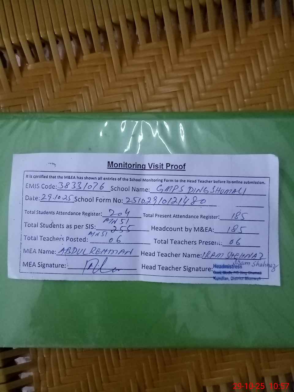 | Attendance Register | Head Teacher | MEA with School | Visit Proof |