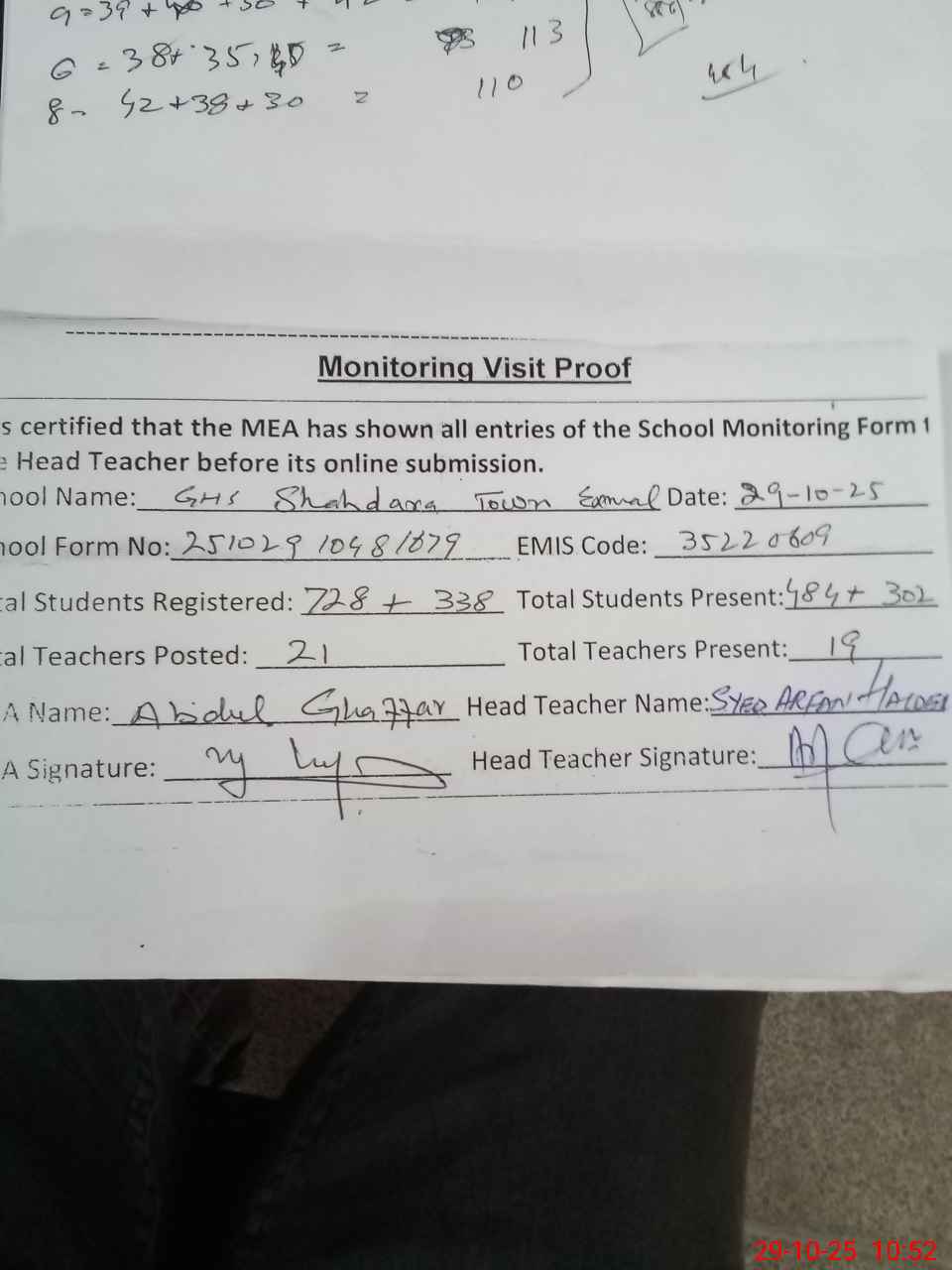 | Remarks (Use Separate Page if Required): Science lab not available Waterman Zulfuqar Ahmed long absent since October 2018 NQ Mehmood Ahmed was on temporary duty since 2015 And no letter available so marked absent Head count variation found 166 students as per roznamcha 35220609 Ghs shahdarah town 29 10 2025 | |||||