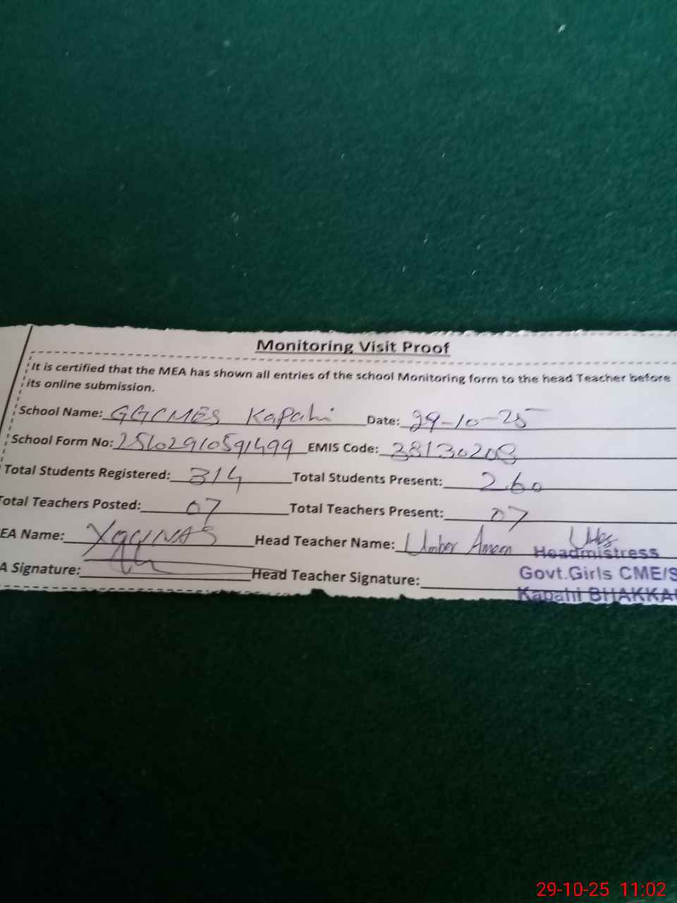 | Attendance Register | Head Teacher | MEA with School | Visit Proof |