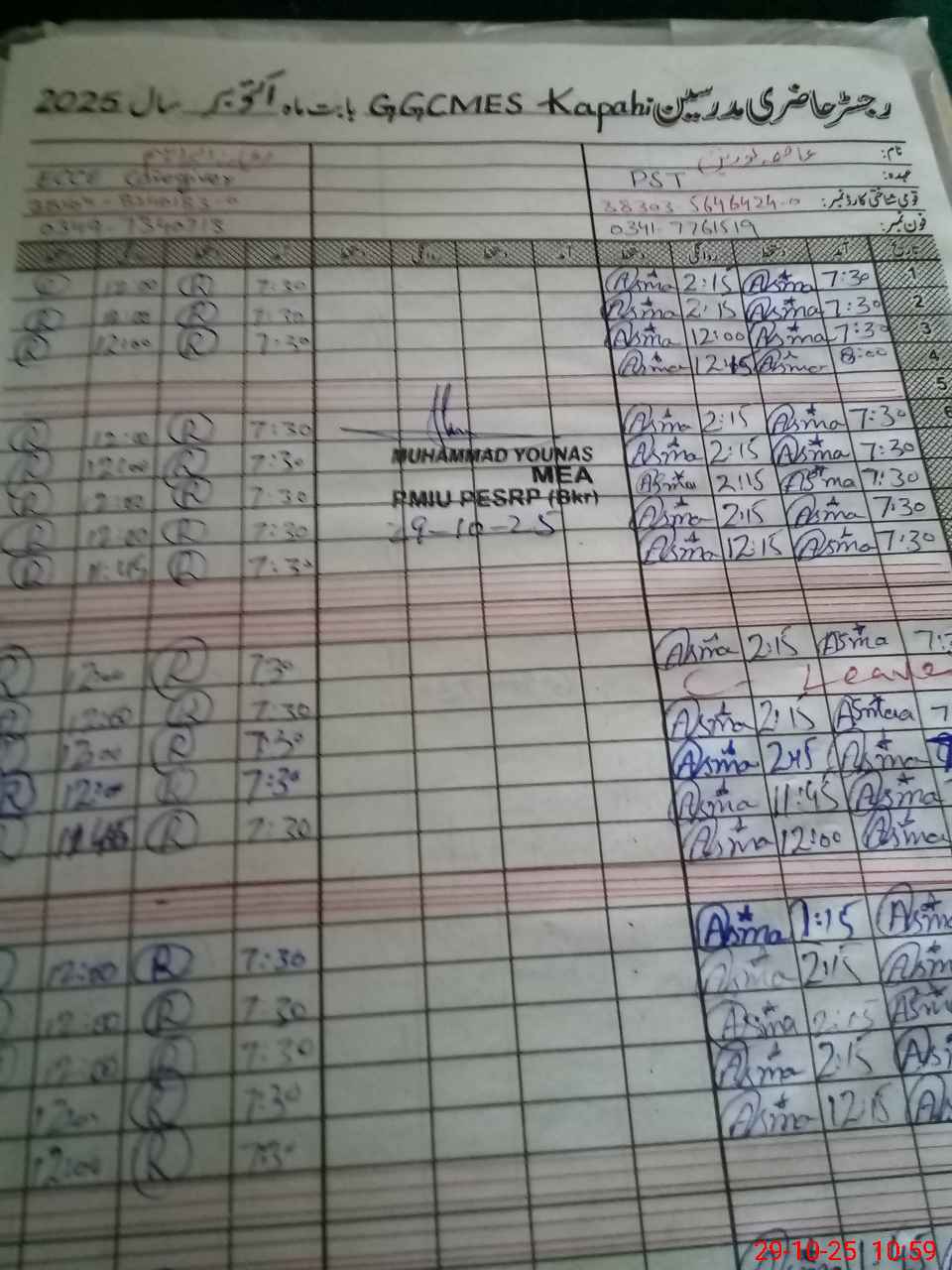 | CNIC | Full Name | Designation | R/C | Absence During Last Calender Month |