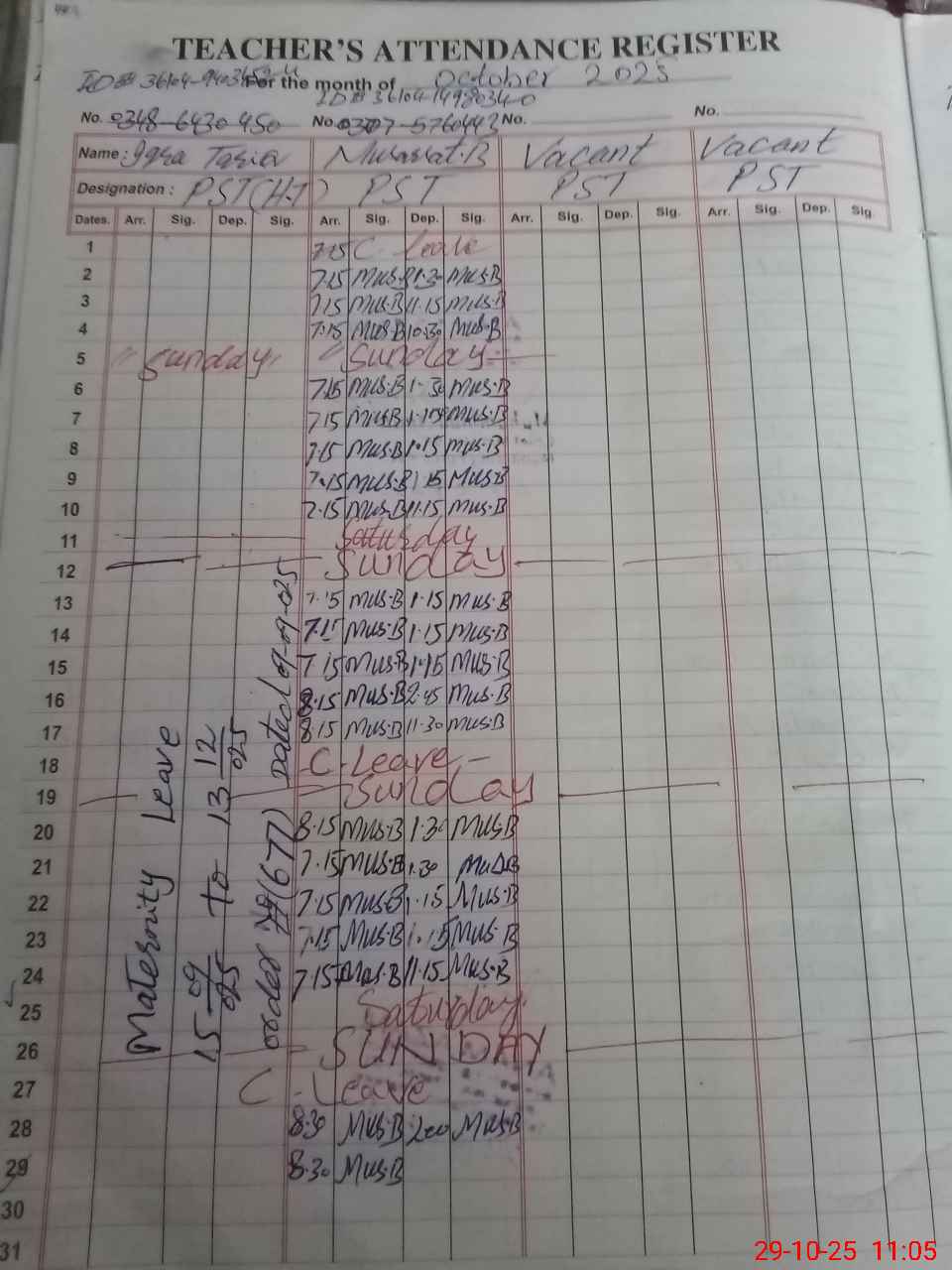 | 36**** | Iq**** Ta**** | PST | Regular | 19 | 0 | 0 | 16 | 0 | 0 | 0 | 0 | 3 | Maternity |