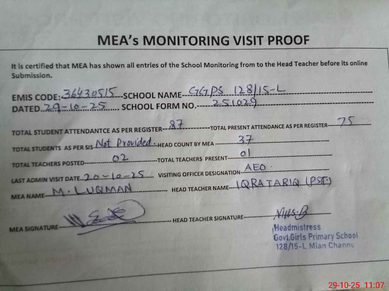 | Attendance Register | Head Teacher | MEA with School | Visit Proof |