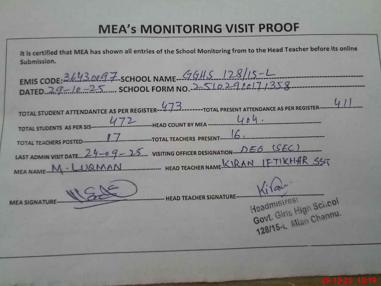 | EMIS Code: 36430097 | Name of School: GGHS 128/15-L MIAN CHANNU | |||
