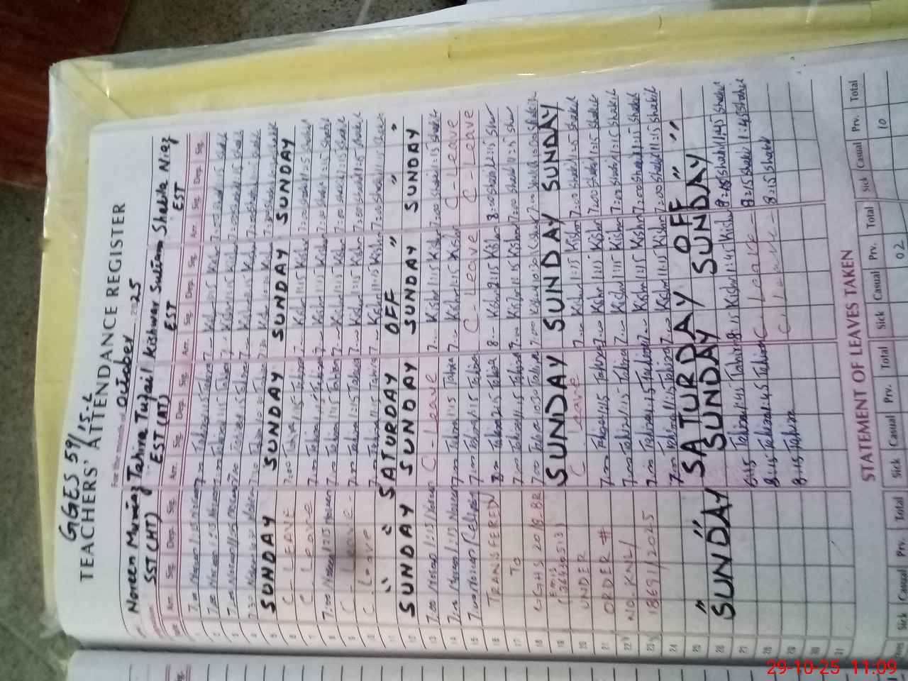 | CNIC | Full Name | Designation | R/C | Absence During Last Calender Month |