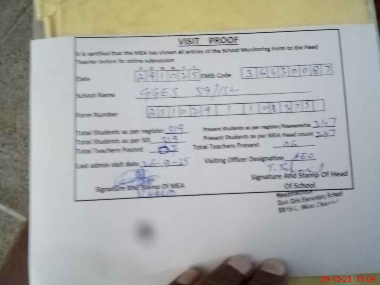 | Attendance Register | Head Teacher | MEA with School | Visit Proof |