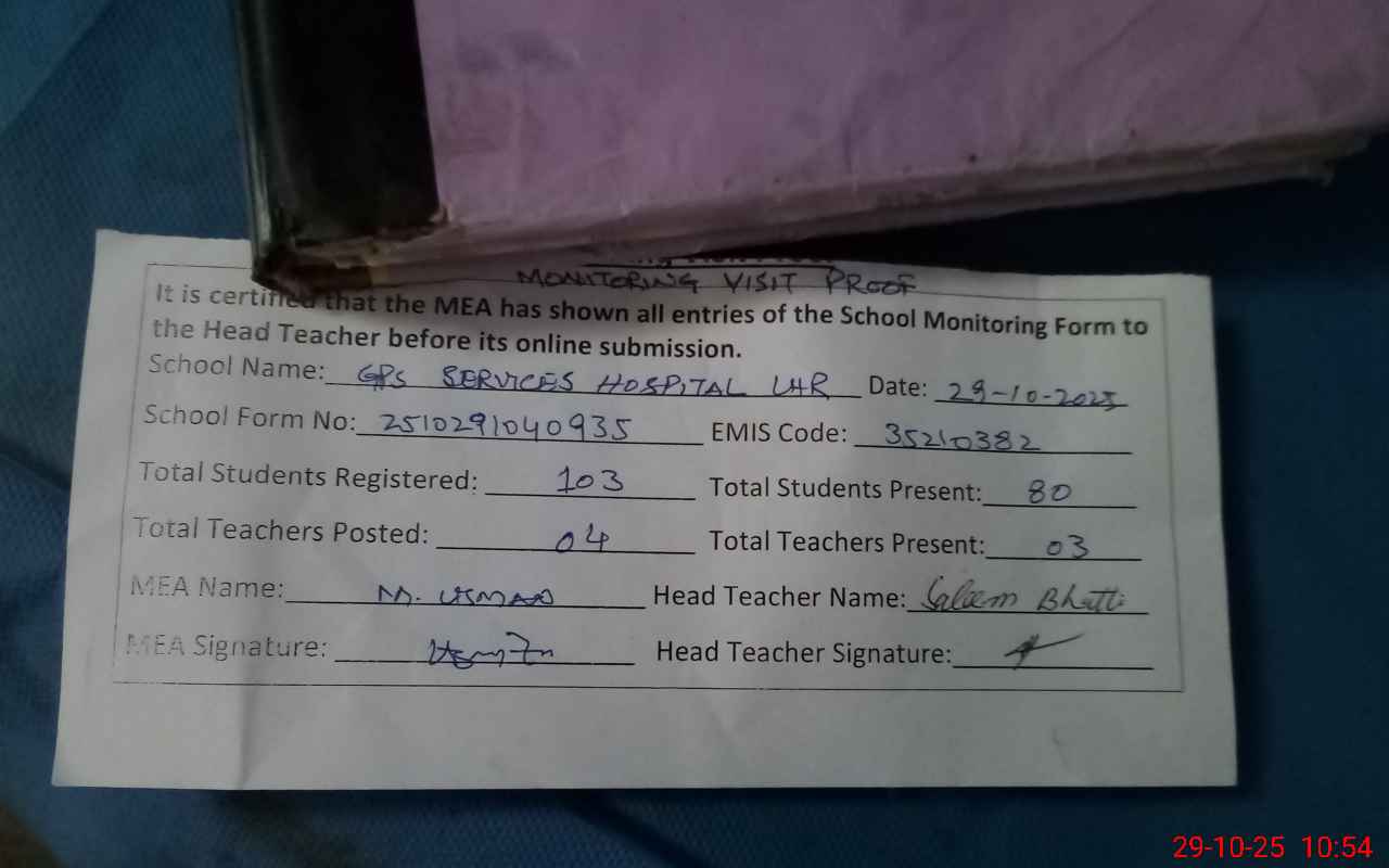 | EMIS Code: 35210382 | Name of School: GPS SERVICES HOSPITAL LHR | |||