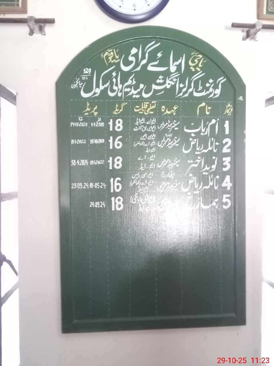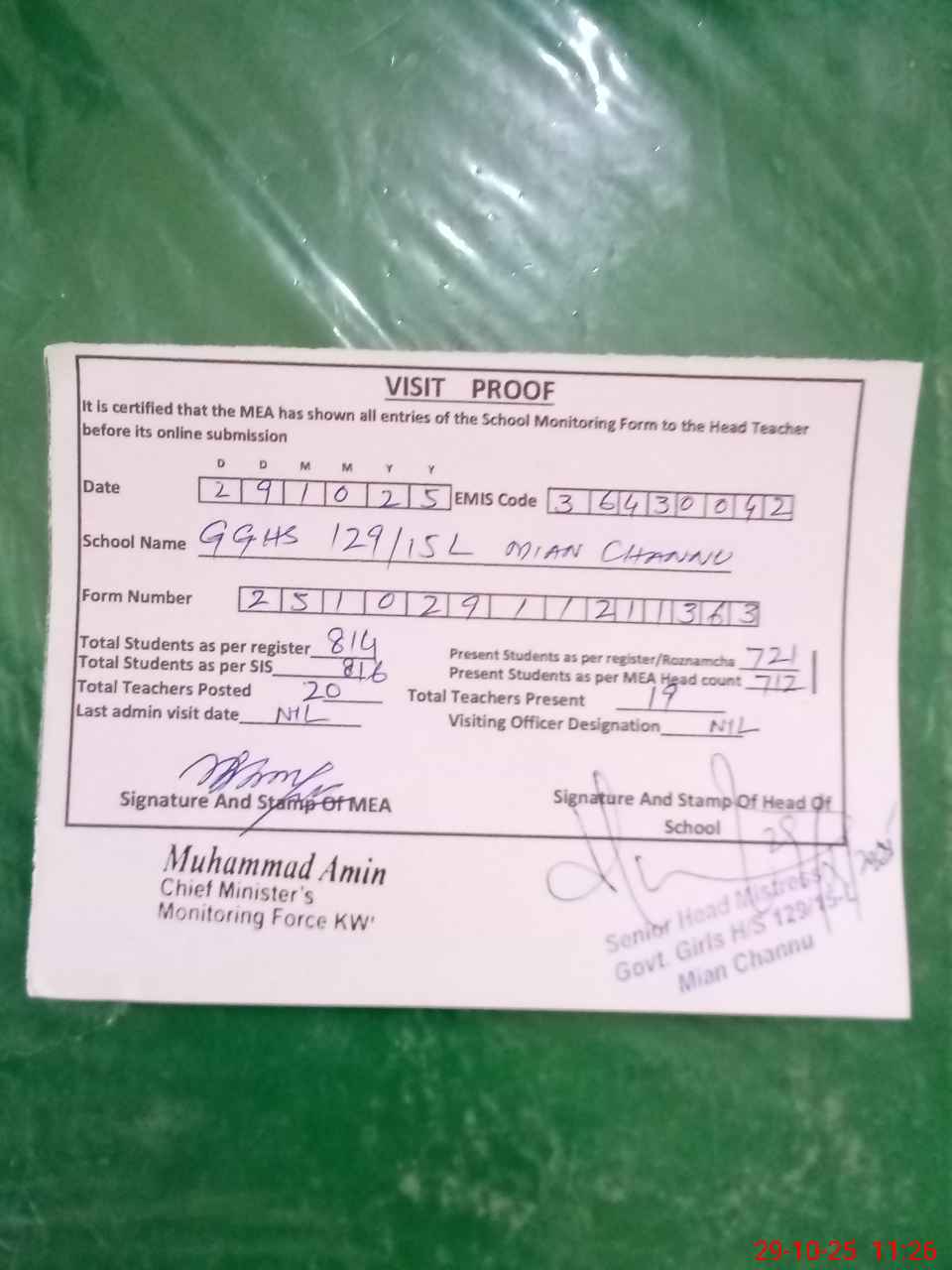 | EMIS Code: 36430042 | Name of School: GGHS 129/15-L, MIAN CHANNU | |||