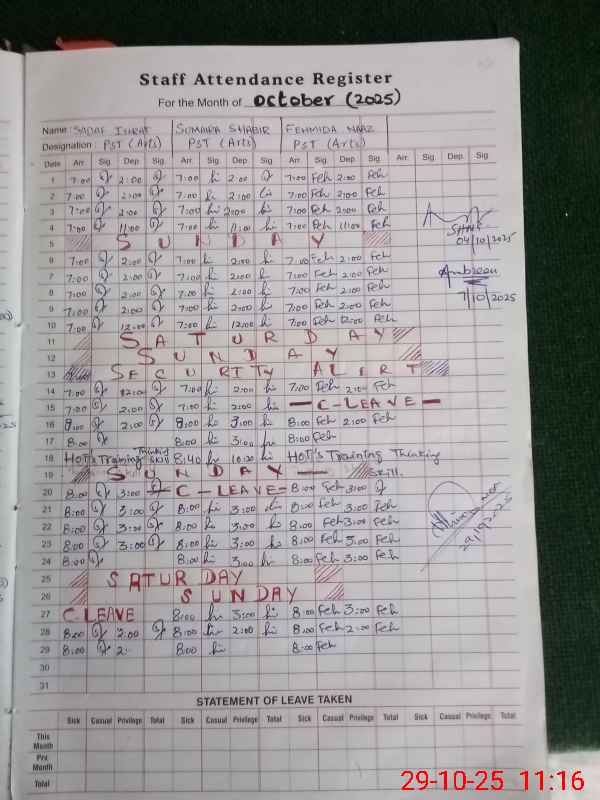 | Monitoring Date: 29-10-2025 | Start Time: 29-10-2025 10:53 AM | End Time: 29-10-2025 11:30 AM | Name of MEA: Ah**** Za**** | |