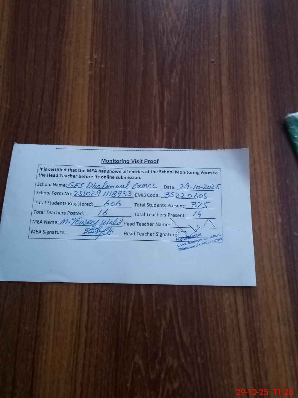 | Remarks (Use Separate Page if Required): Dy Deo visit this school 20 October 2025 As per roznamcha students were present 547 out of 606 and as per head count students were present 375 out of 606 difference found 167 students less Imran Masih sweeper was absent today so I marked him absent and in this month 12 days completely absent and previous month 1 day absent | |||||