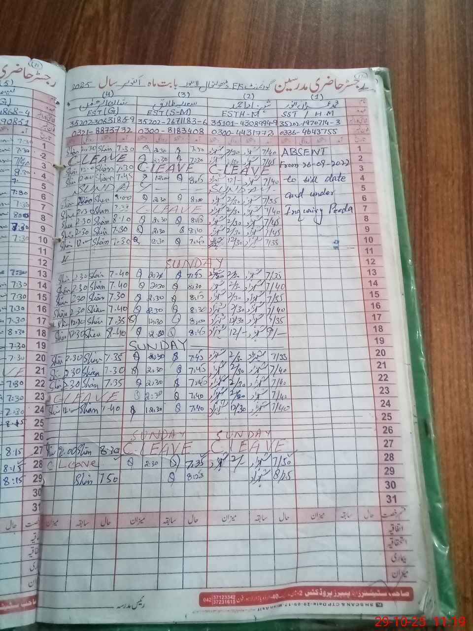 | CNIC | Full Name | Designation | R/C | Absence During Last Calender Month |