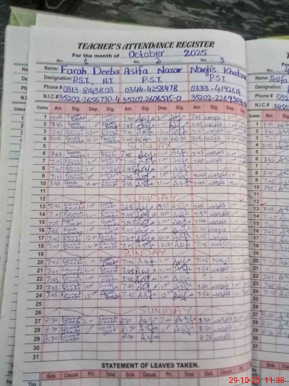 | CNIC | Full Name | Designation | R/C | Absence during last cal. month |