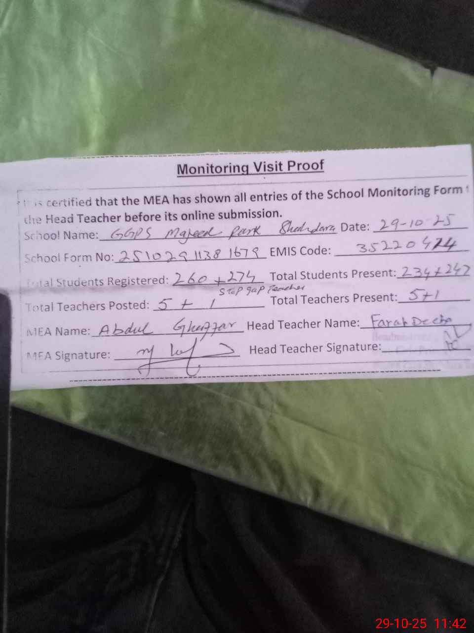 | EMIS Code: 35220414 | Name of School: GGPS MAJEED PARK SHAHDRA | |||