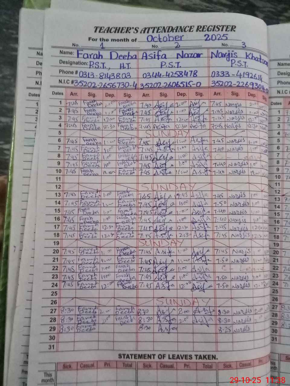 | CNIC | Full Name | Designation | R/C | Absence During Last Calender Month |