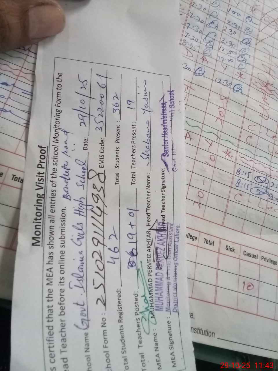 | Attendance Register | Head Teacher | MEA with School | Visit Proof |