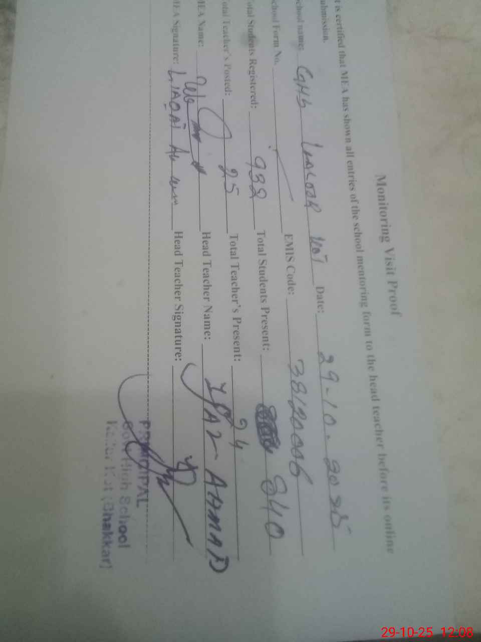 | Attendance Register | Head Teacher | MEA with School | Visit Proof |