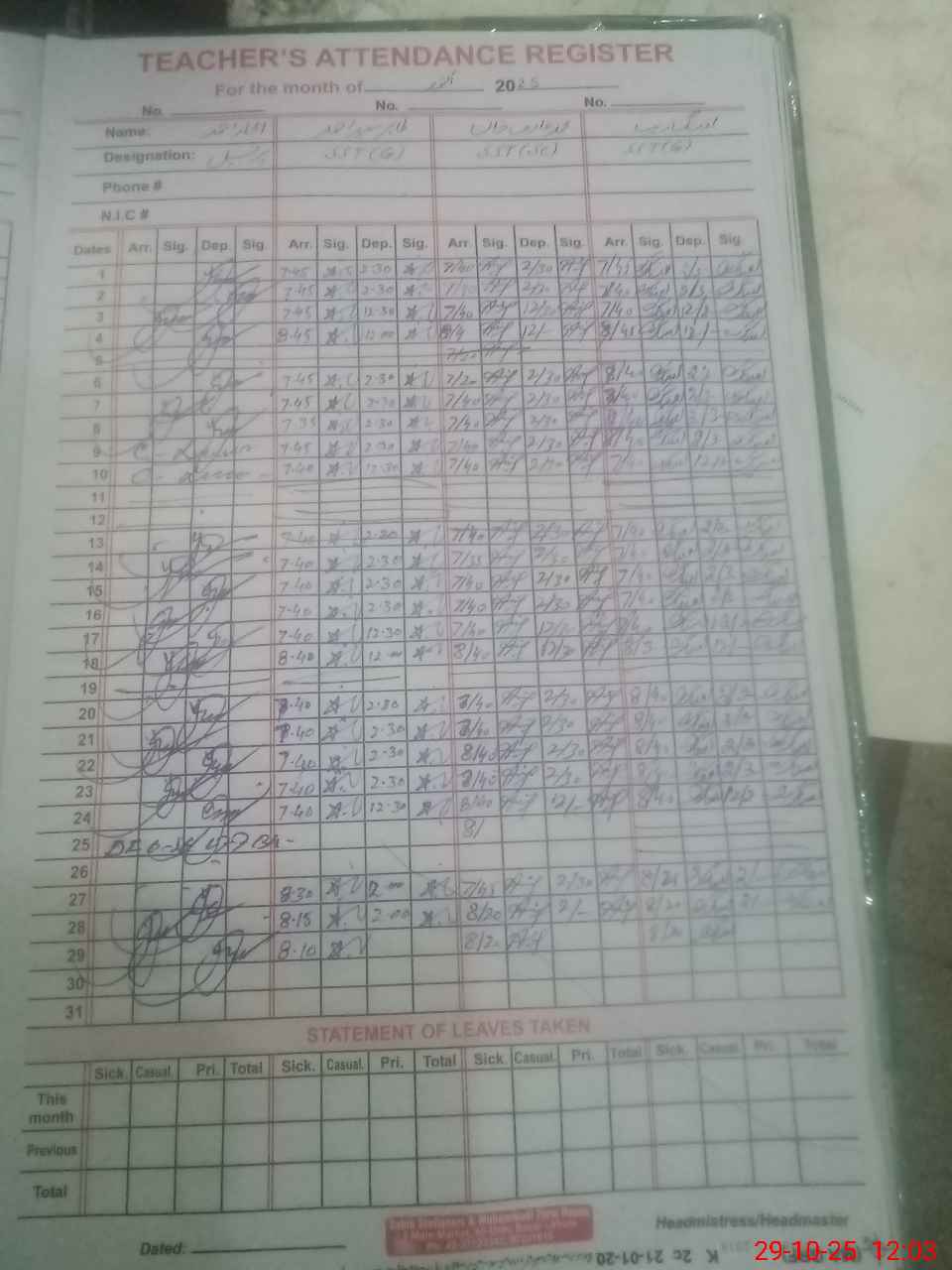 | CNIC | Full Name | Designation | R/C | Absence During Last Calender Month |