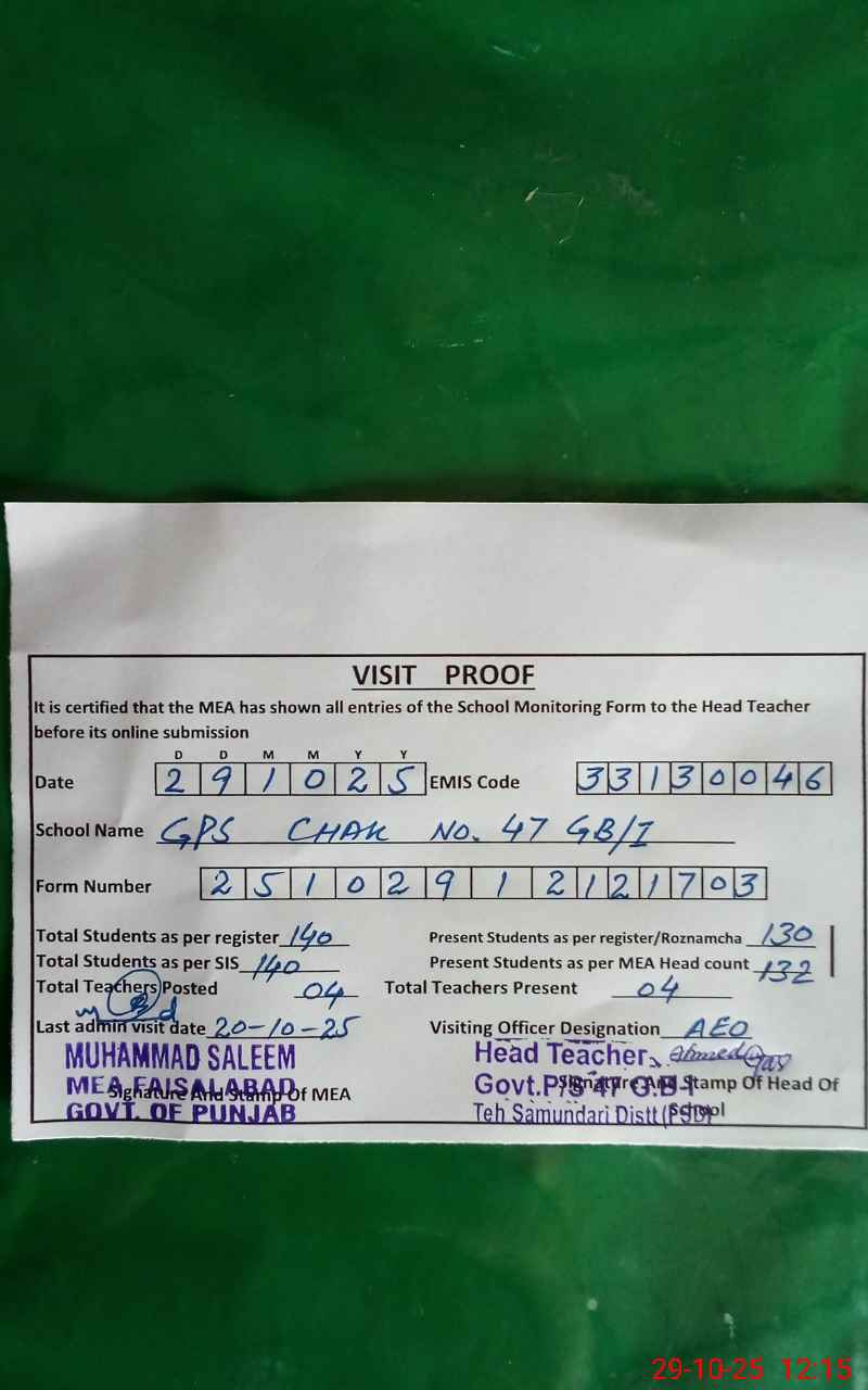 | EMIS Code: 33130046 | Name of School: GPS CHAK 47 GB SAMUNDRI | |||