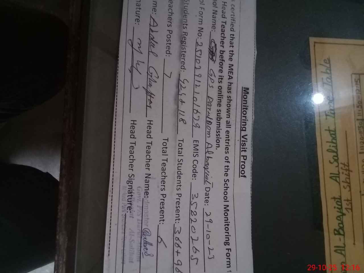 | Attendance Register | Head Teacher | MEA with School | Visit Proof |