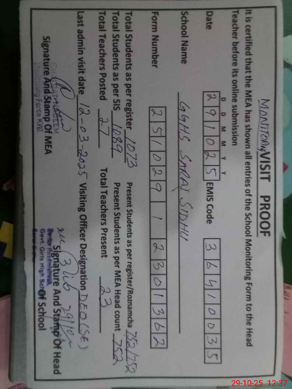 | EMIS Code: 36410035 | Name of School: GGHS SARAI SIDHU | |||