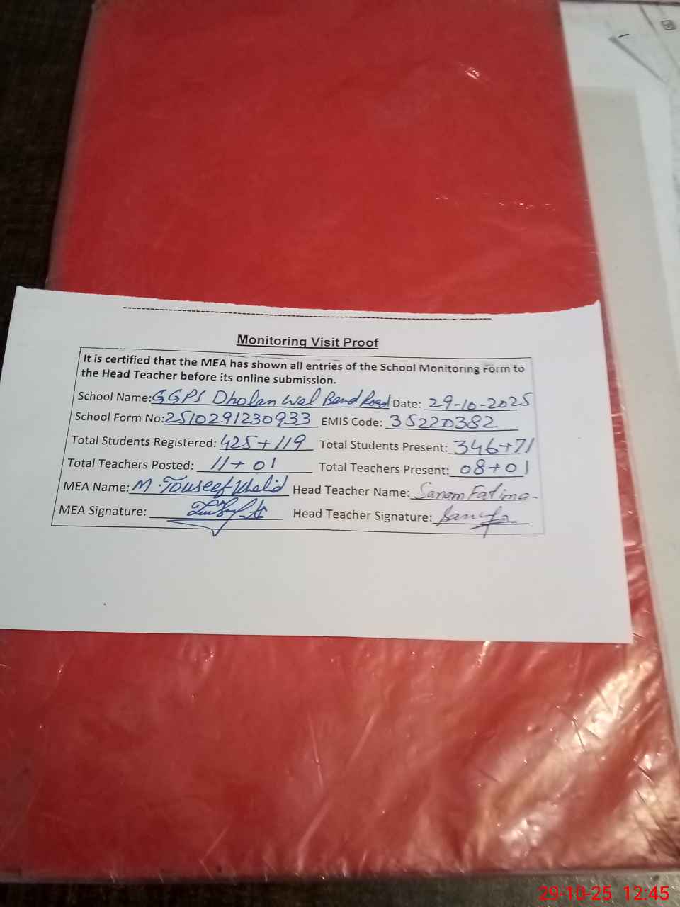 | Attendance Register | Head Teacher | MEA with School | Visit Proof |