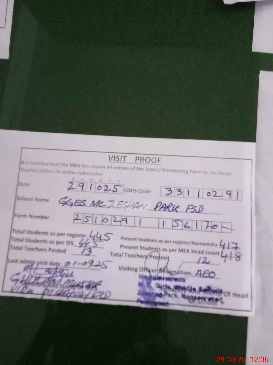 | Attendance Register | Head Teacher | MEA with School | Visit Proof |
