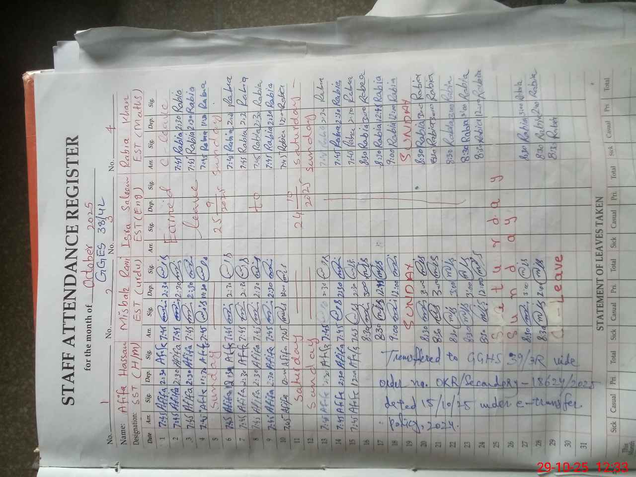 | Remarks (Use Separate Page if Required): I have to visit GGES 38 4L Miss Isra saleem NIC No 3530202314182 is absent from 25 Oct 2025 to till | |||||
