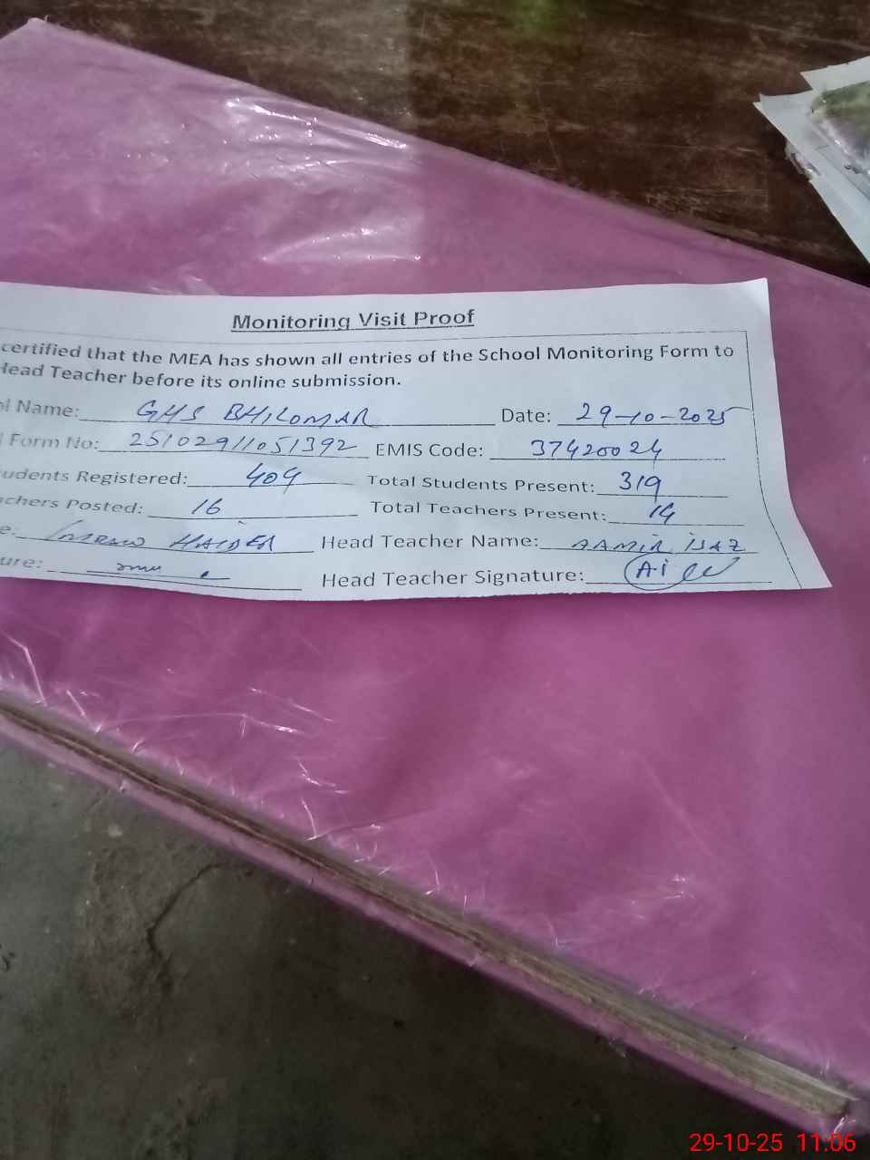 | Attendance Register | Head Teacher | MEA with School | Visit Proof |