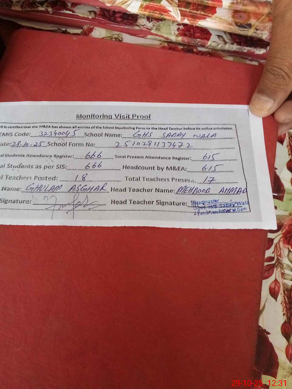 | Attendance Register | Head Teacher | MEA with School | Visit Proof |