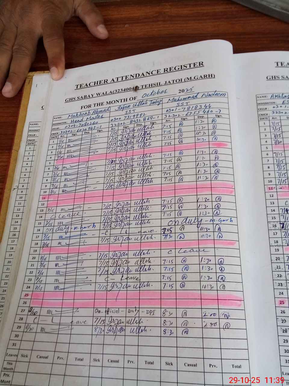 | Name: IR**** UL**** TA**** Designation: (School Headmaster's/Headmistress's) S.S.T.(GEN) Phone/Cell Number: 03**** |