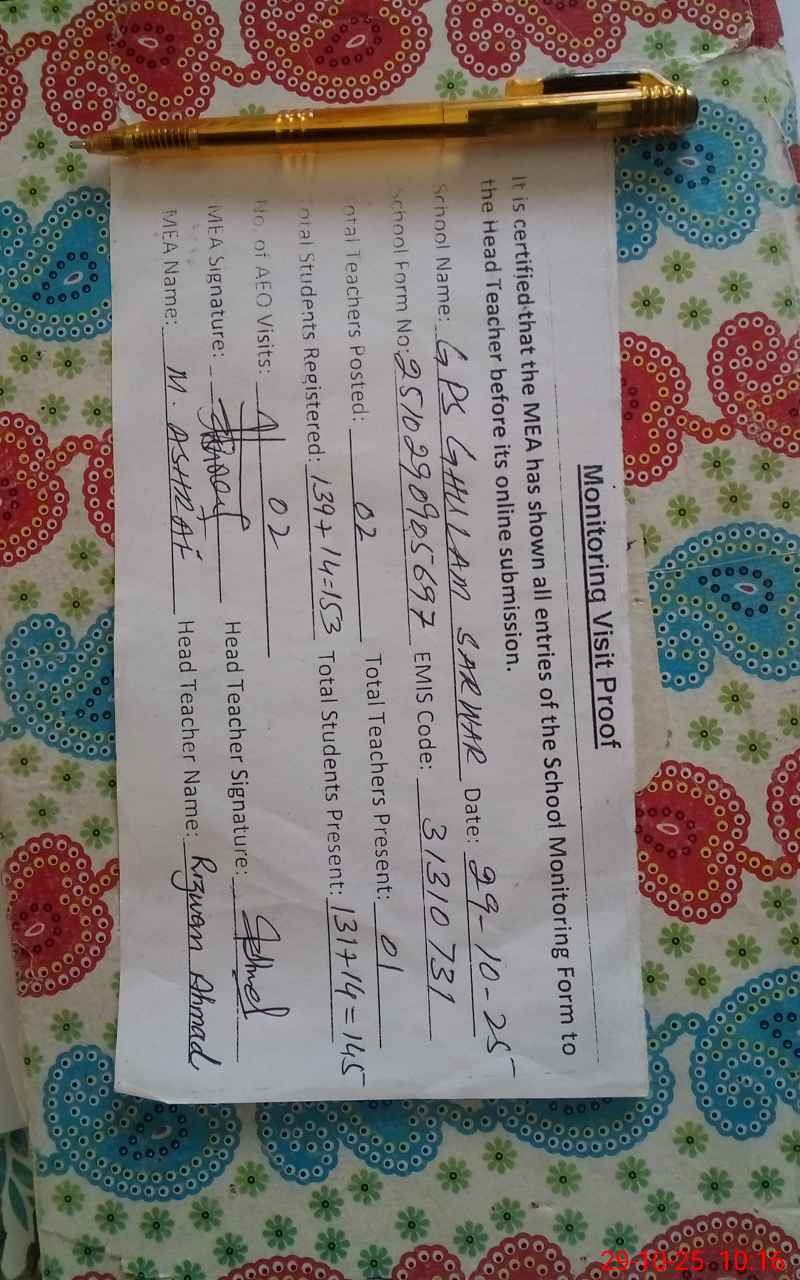 | EMIS Code: 31310731 | Name of School: GPS GHULAM SARWAR SHAH | |||