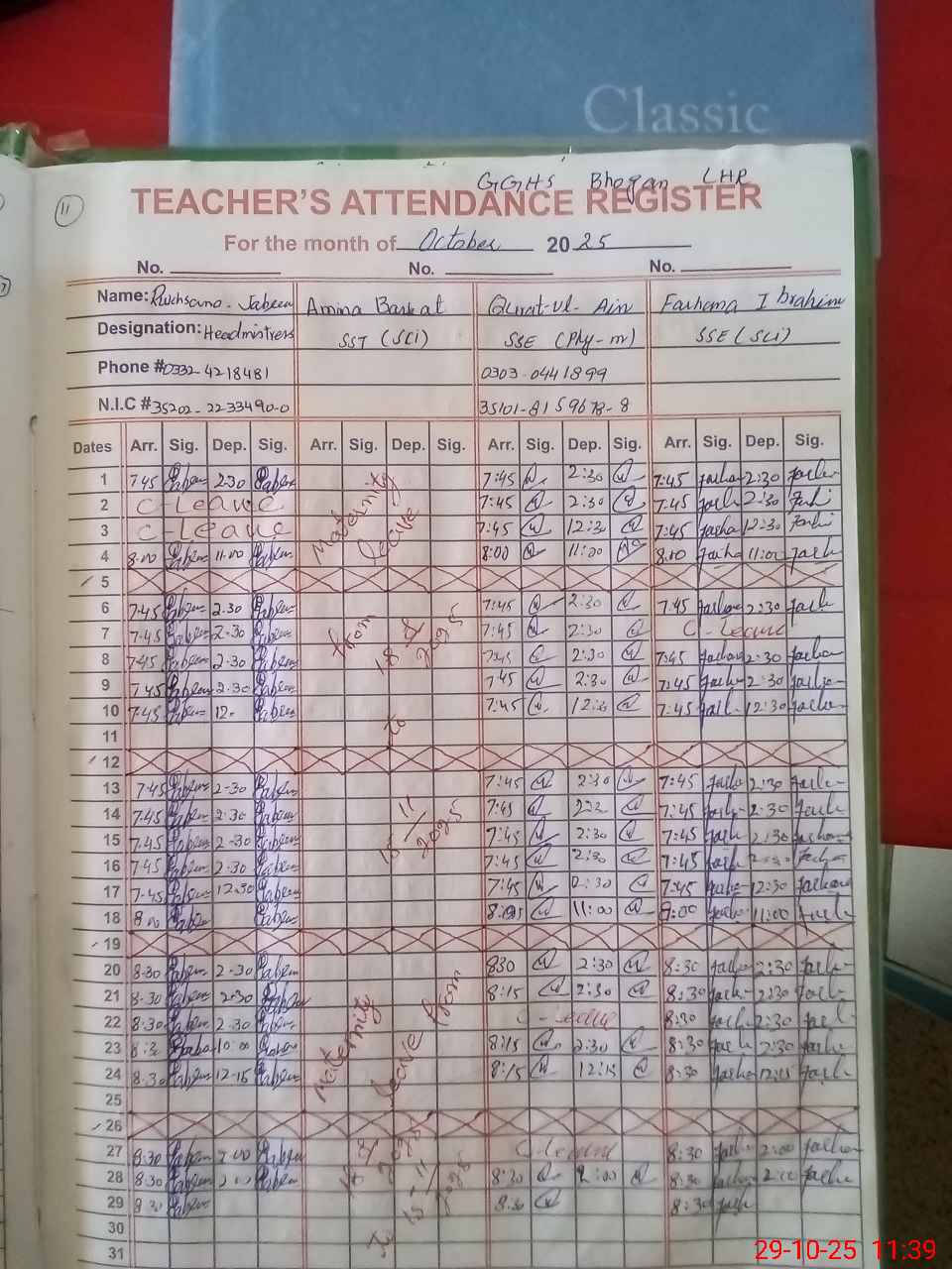 | CNIC | Full Name | Designation | R/C | Absence during last cal. month |