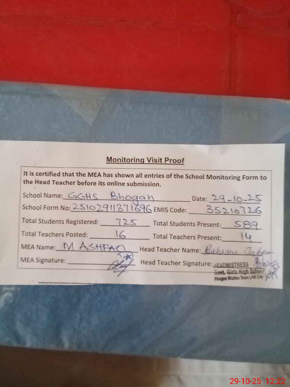 | Attendance Register | Head Teacher | MEA with School | Visit Proof |