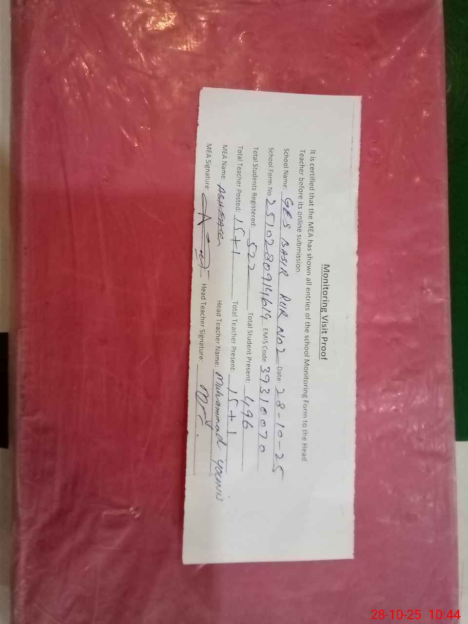 | Attendance Register | Head Teacher | MEA with School | Visit Proof |
