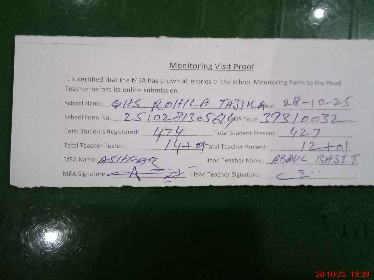 | Attendance Register | Head Teacher | MEA with School | Visit Proof |
