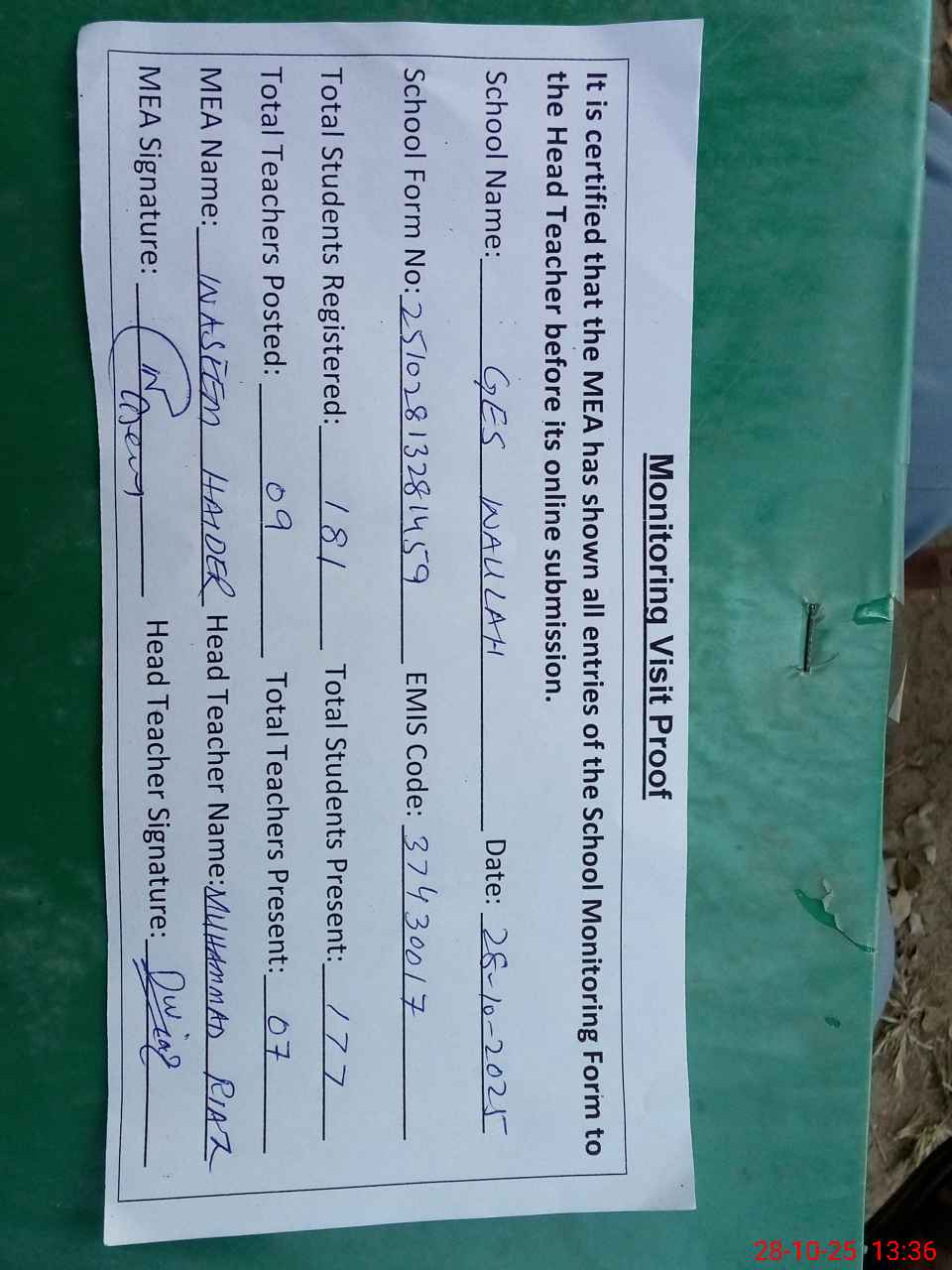 | Attendance Register | Head Teacher | MEA with School | Visit Proof |