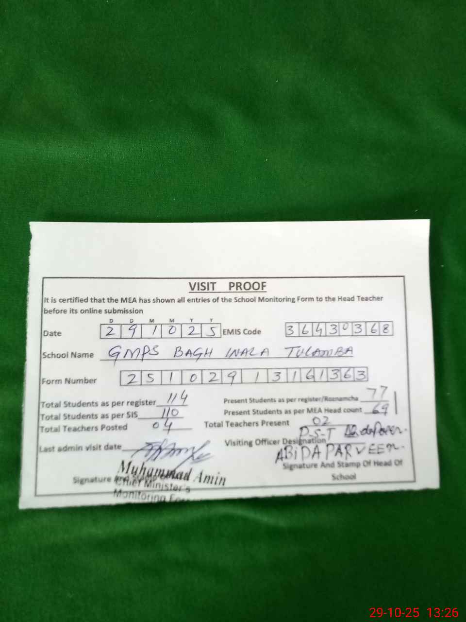 | EMIS Code: 36430368 | Name of School: GMPS BAGH WALA, TULAMBA | |||
