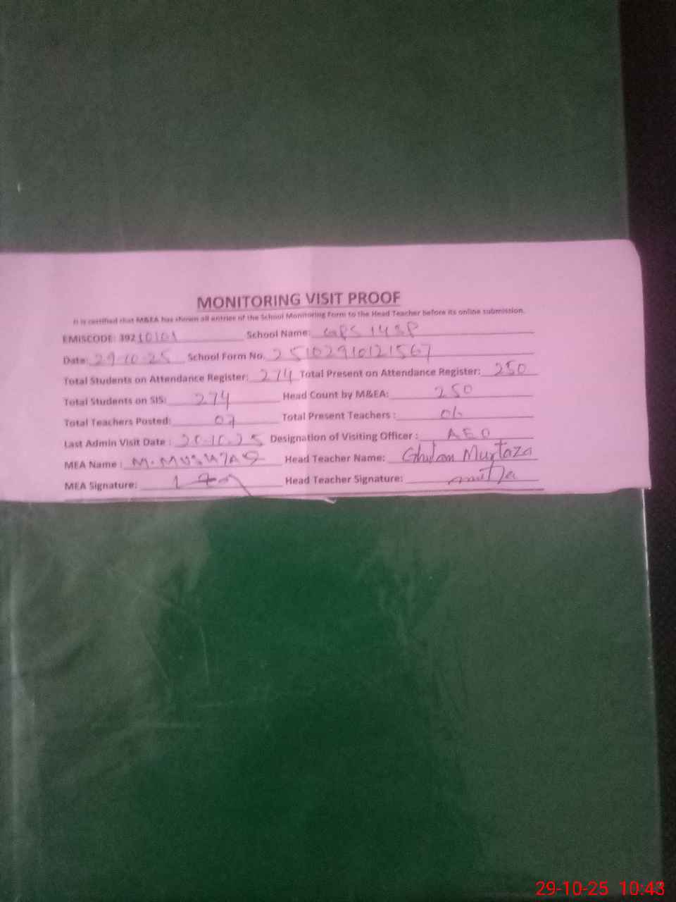 | Attendance Register | Head Teacher | MEA with School | Visit Proof |