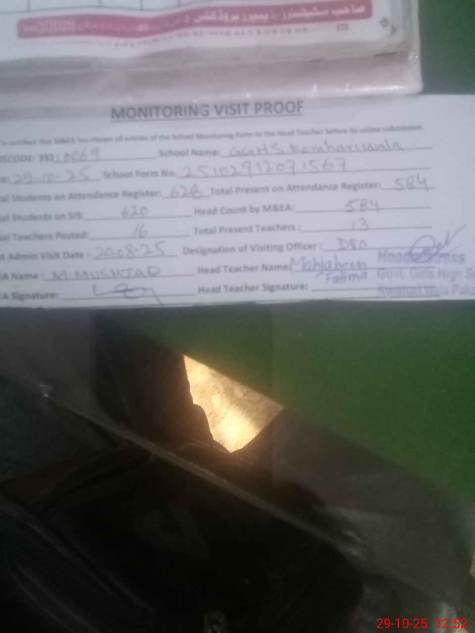 | Attendance Register | Head Teacher | MEA with School | Visit Proof |