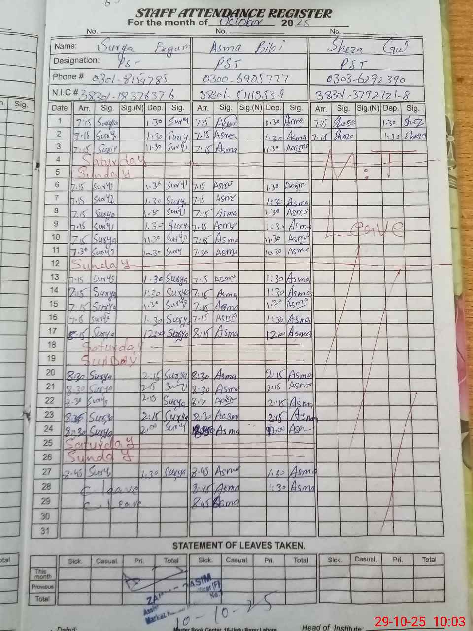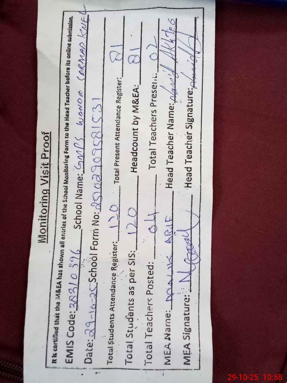 | Remarks (Use Separate Page if Required): No Aeo visit since 22nd April 2025 This school consist of two buildings in One building one room is in dangerous condition boundary wall is also in dangerous condition and two toilets are nonfunctional however no classes are being conducted in said building Teacher Shiza Gul marked as absent as she is on MT leave since 03 October 2025 however her leave waiting for approval from the authorities concerned till date and nothing else was shown about MT leave | |||||