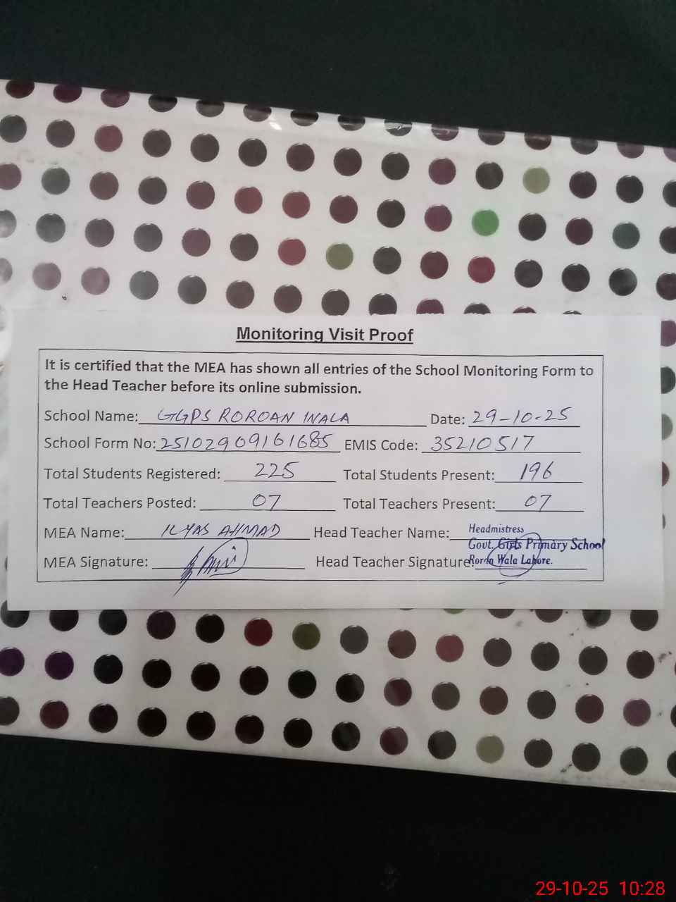 | Certified that this School was Inspected by the Undersigned MEA/DMO Today and the Information Stated Above is as Per Record. | |||||