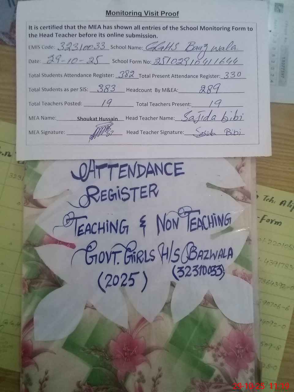 | Attendance Register | Head Teacher | MEA with School | Visit Proof |