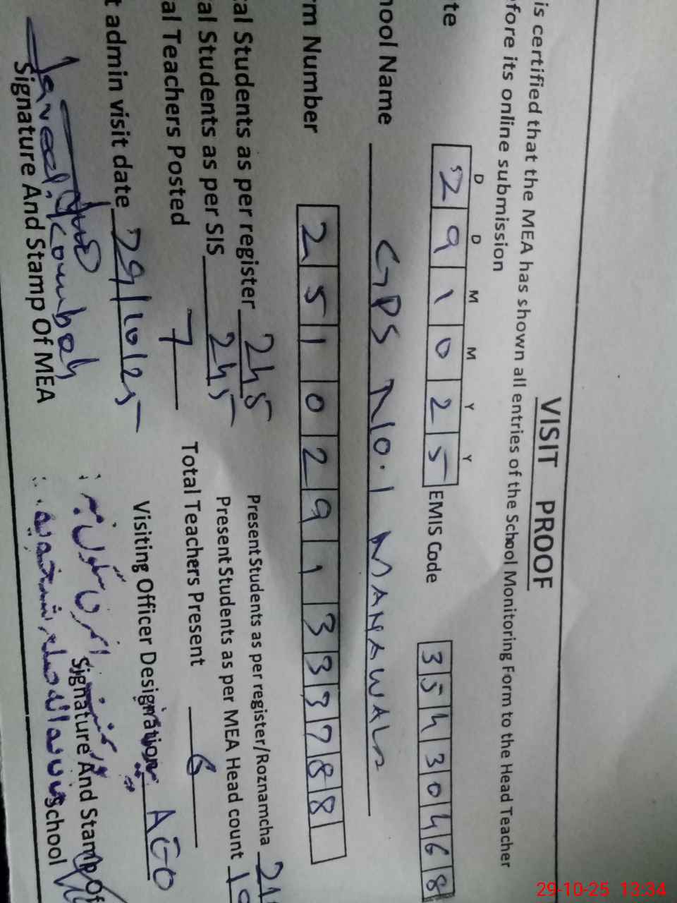 | Attendance Register | Head Teacher | MEA with School | Visit Proof |